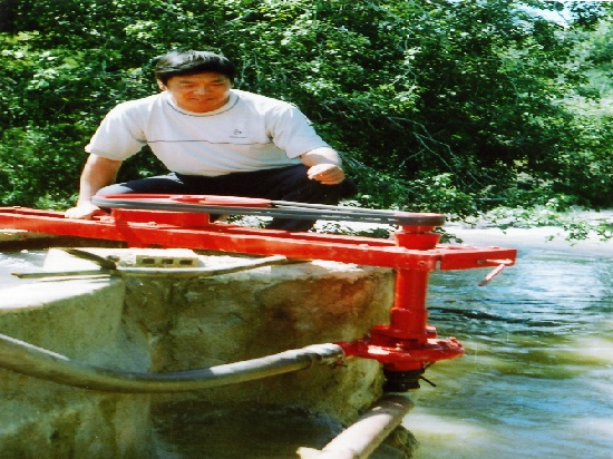 Thầy Huân bên đứa con tinh thần: máy bơm nước chạy bằng sức nước